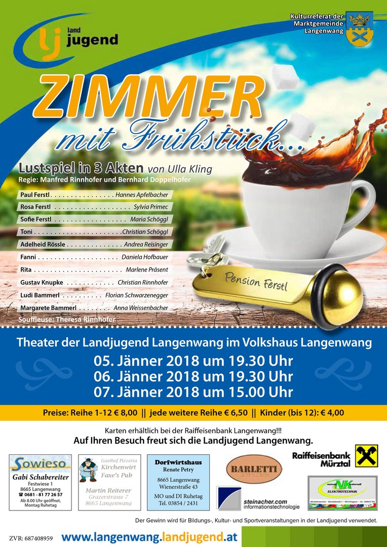 Von 5. bis 7. Jänner ist es wieder soweit, unser alljährliches Theater im Volkshaus Langenwang findet statt. Dieses Jahr wird das Stück "Zimmer mit Frühstück" von Ulla Kling aufgeführt.